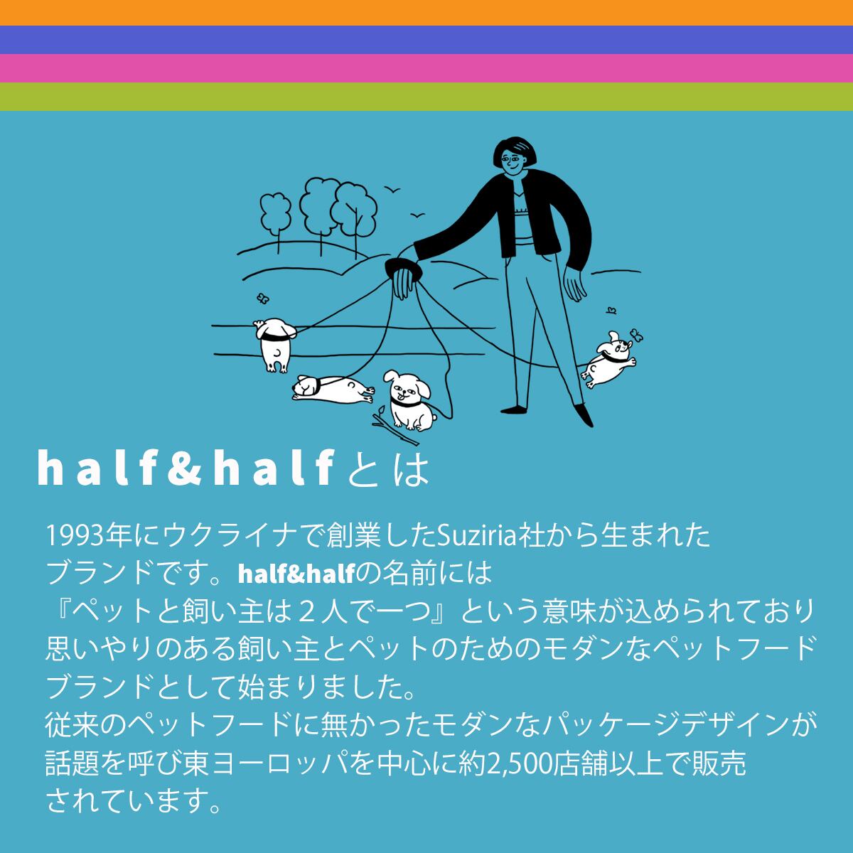 1993年にウクライナで創業したSuziria社から生まれたブランドです。【Half&Half】の名前には『ペットと飼い主は2人で一つ』という意味が込められており、思いやりのある飼い主とペットのためのモダンなペットフードブランドとして始まりました。従来のペットフードに無かったモダンなパッケージデザインが話題を呼び東ヨーロッパを中心に約2,500店舗以上で販売されています。