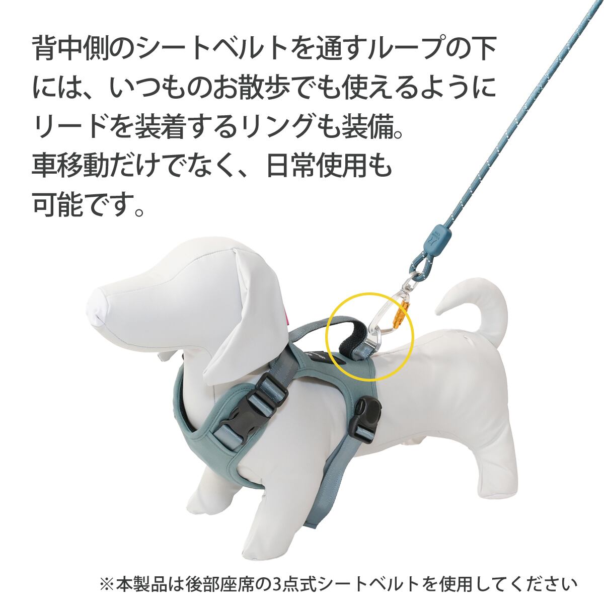 背中側のシートベルトを通すループの下には、いつものお散歩でも使えるようにリードを装着するリングも装備しているので、車移動だけでなく、日常使用も可能です